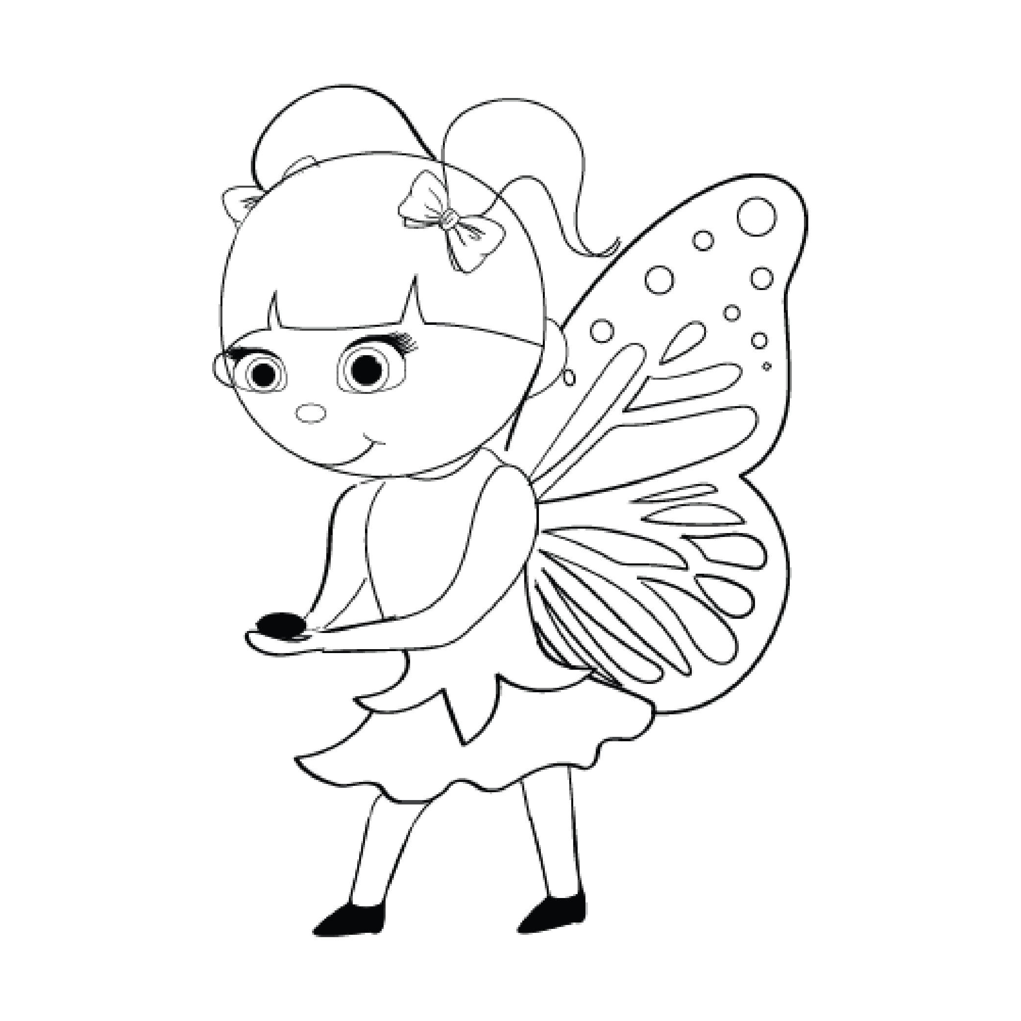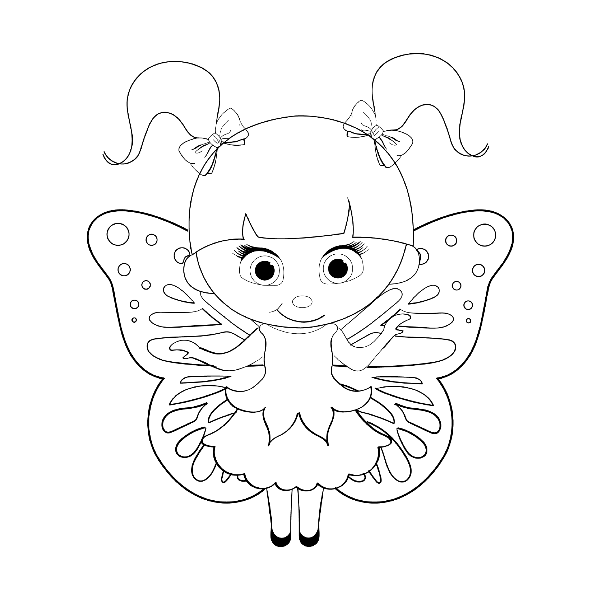 Wisteria is a small young fairy with butterfly wings, who lives in the woods. She is whimsical and likes to wander. She loves shiny and sparkly objects, and she enjoys collecting them while she is wandering in the woods. She loves her friends and shows her love by gifting these shiny objects to them. Her love of shiny things is shown in her sparkly purple bows that she wears in her pig tails.
