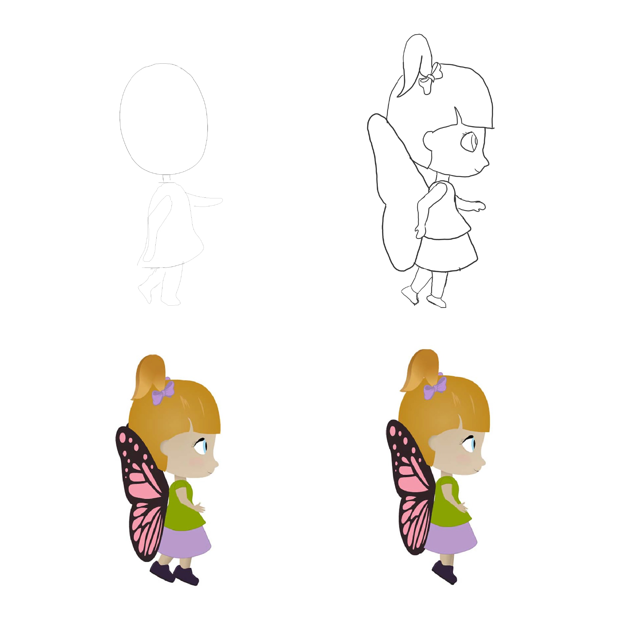 Animating Wisteria was an immersive process. I dressed up as her—complete with butterfly wings—and recorded videos of myself skipping to create an authentic walk cycle. I began by sketching the walk cycle, then refined her skipping motion using the puppet method for animation.